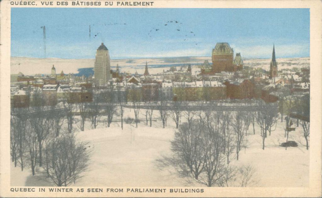 Vue des bâtisses du Parlement, Québec, [Vers 1940], Archives nationales à Montréal, Fonds Laurette Cotnoir-Capponi, (06M,P186,S9,P258), Cotnoir-Capponi, Laurette.