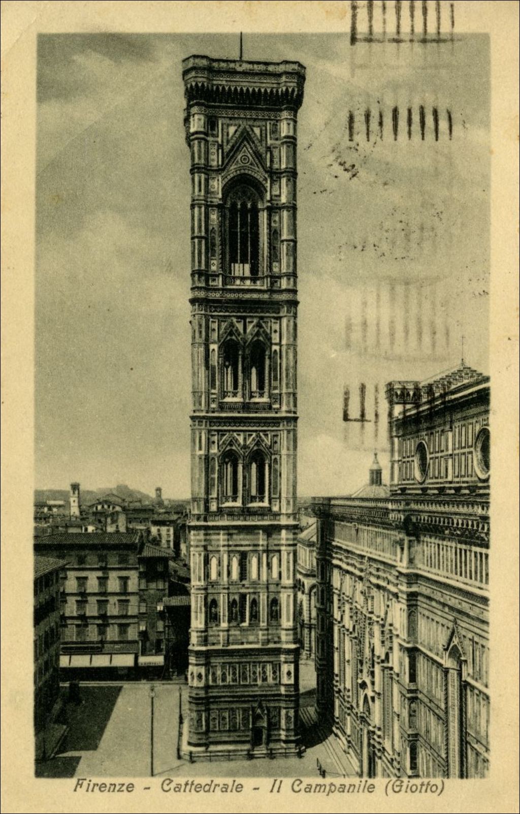 - Il s'agit du clocher de la cathédrale de Florence, en Italie. La carte postale datée du 15 novembre 1921 est adressée à Monsieur et Madame Léon-Narcisse Cotnoir de la part de Laurette et Laure