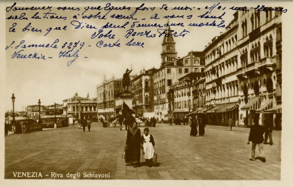 - Il s'agit d'une vue de la rive de la ville de Venise, en Italie. La carte postale n'est pas datée, ni adressée, mais elle provient de la part de Renzo Forti