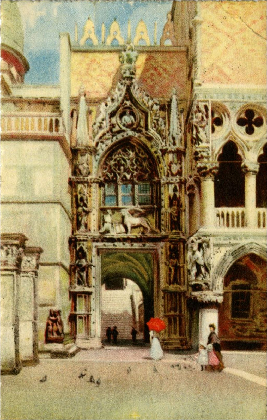 - Il s'agit de la porte des papiers entre le palais des Doges et la basilique Saint-Marc, à Venise, en Italie. La carte postale datée du 14 février 1928 est adressée à madame Léon-Narcisse Cotnoir de la part de Rodolphine