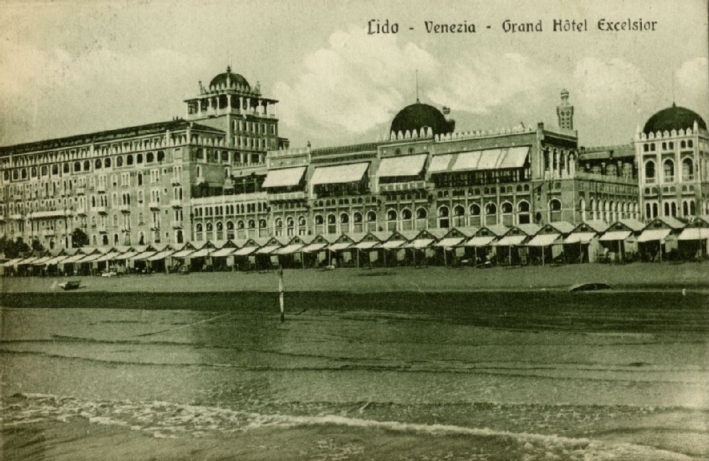 Il s'agit due vue de la plage du Lido et du Grand hôtel Excelsior, à Venise, en Italie. La carte postale est la cinquième d'une série
