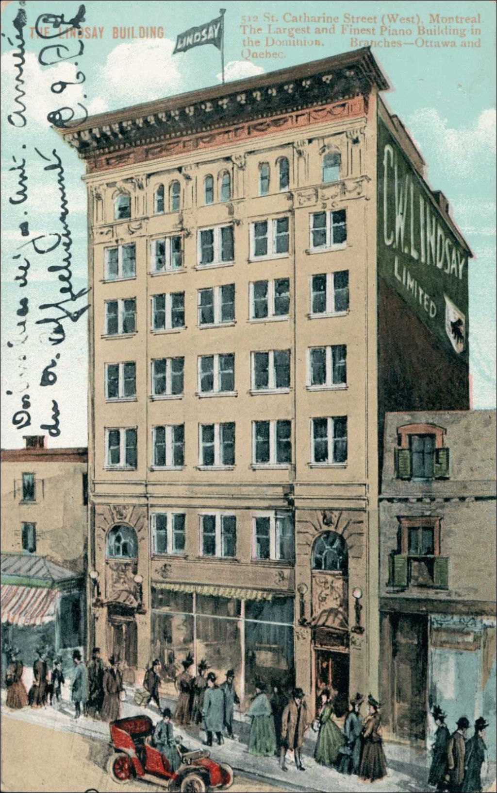 The Lindsay Building, the Largest and Finest Piano Building in the Dominion. Branches - Ottawa and Quebec