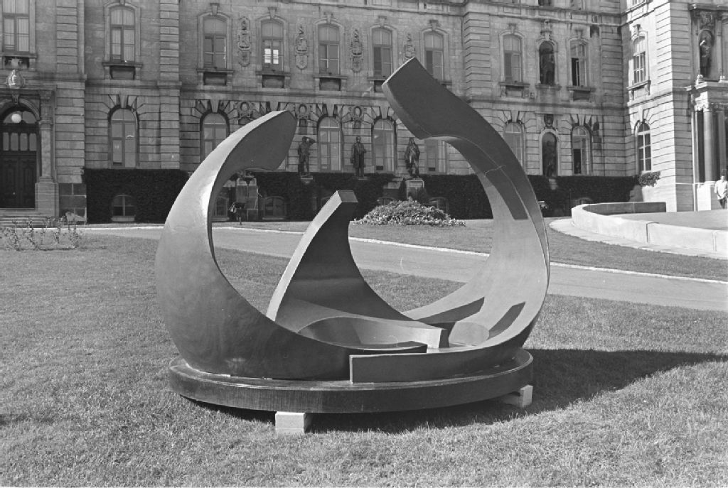 Sculpture située face au Parlement et construction du pont Pierre Laporte