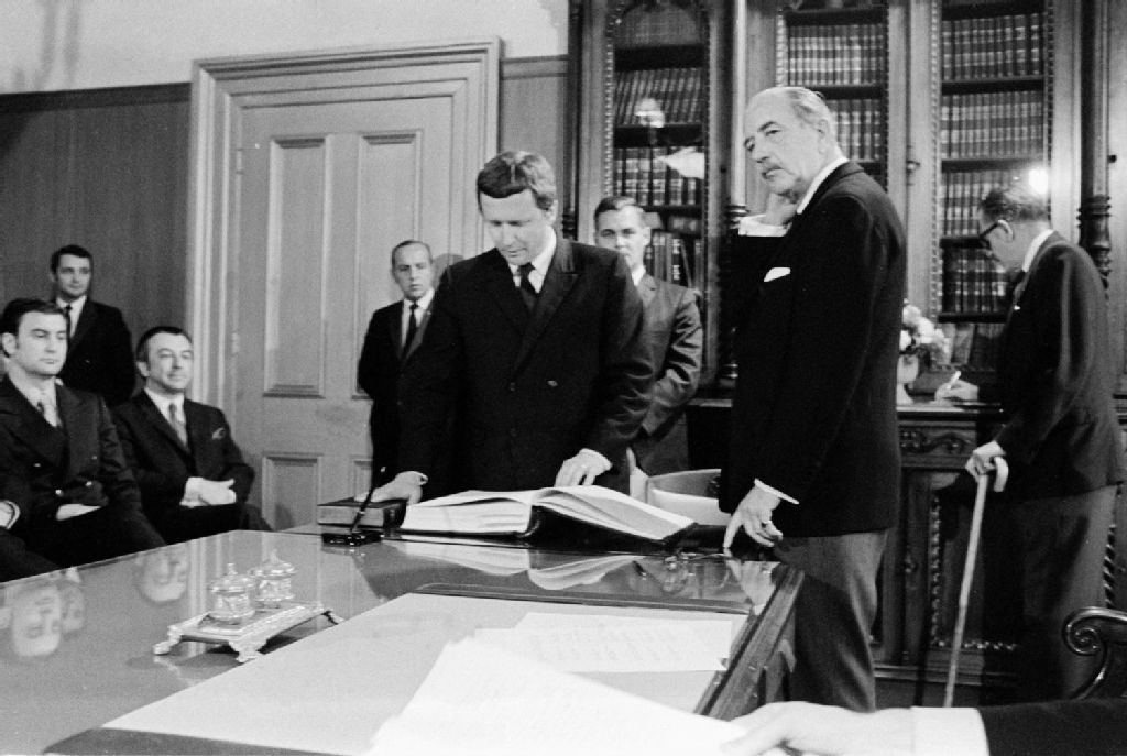 Assermentation du cabinet Bourassa, 1970-05, Archives nationales à Québec, Fonds Ministère des Communications, (03Q,E10,S44,SS1,D70-116), Jules Rochon.