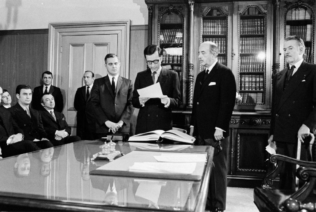 Assermentation du cabinet Bourassa, 1970-05, Archives nationales à Québec, Fonds Ministère des Communications, (03Q,E10,S44,SS1,D70-117), Jules Rochon.