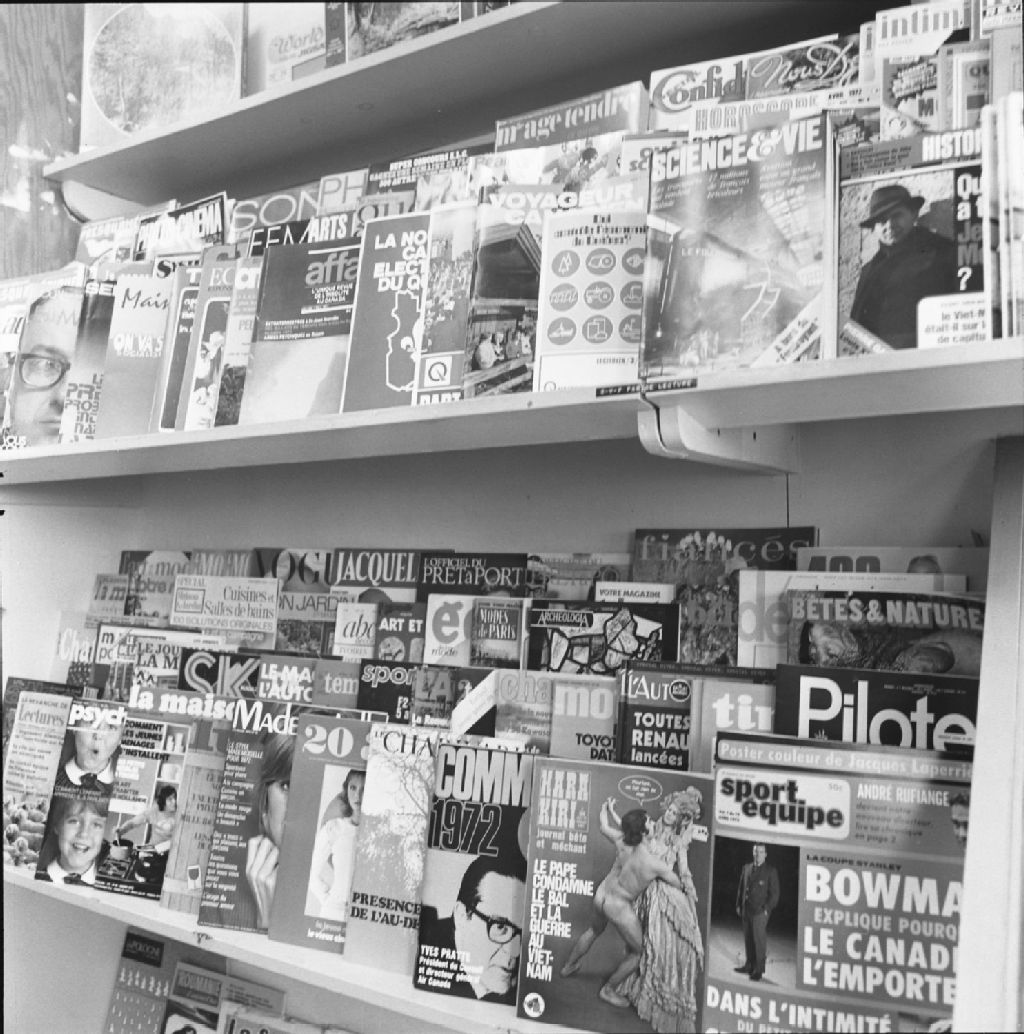 Monsieur Rock Lefebvre, éditeur du Québec, Rosanne Leblond travaillant sur un télex et reportage sur l'étalage de revues brûlées à la tabagie Giguère