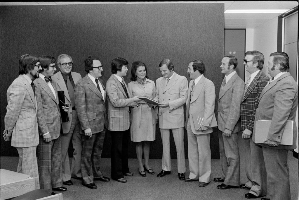 Congrès des Hebdos du Canada avec le ministre Claude Simard et le Comité du Carnaval de Chicoutimi et tournoi de golf au Club royal de Québec avec J. P. Légaré, Roger Lussier, J.C. Langlois, Claude Simard et Nicole Blouin Vallée, 1974-09-19, Archives nationales à Québec, Fonds Ministère des Communications, (03Q,E10,S44,SS1,D74-609), Bernard Vallée.