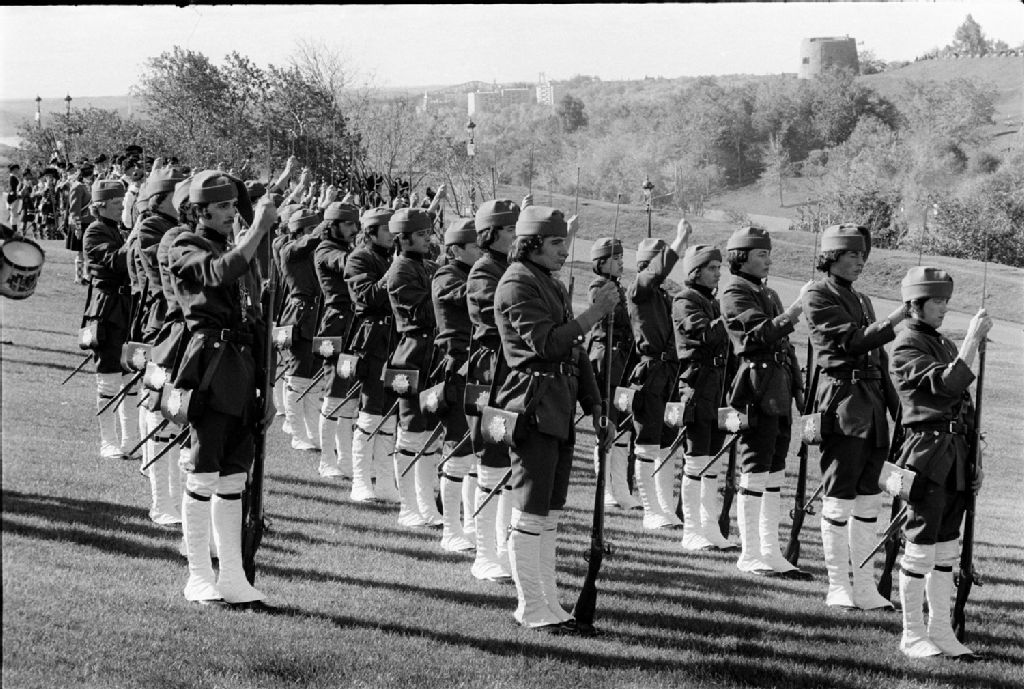 Reconstitution historique de l'attaque de Québec par Arnold et Montgomery sur les plaines d'Abraham, 1975, Archives nationales à Québec, Fonds Ministère des Communications, (03Q,E10,S44,SS1,D75-788), Photographe non identifié.