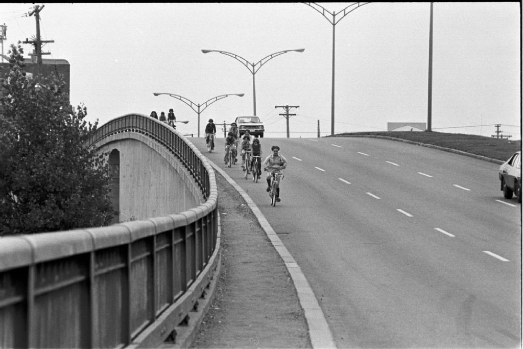 Cyclistes sur le boulevard Charest, halte routière de Saint-Rédempteur et compagnie de bois Weyerhaeuser Canada Limited à Princeville