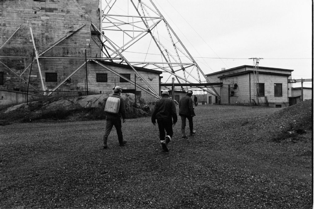 Mineurs se rendant dans la mine par la recette du puits à jour, sortie de secours, fonds de galerie inopérante, cloison de toile pour couper l'aérage en cas de feu et cloison de bois, 1976-08-31, Archives nationales à Québec, Fonds Ministère des Communications, (03Q,E10,S44,SS1,D76-509), Bernard Vallée.