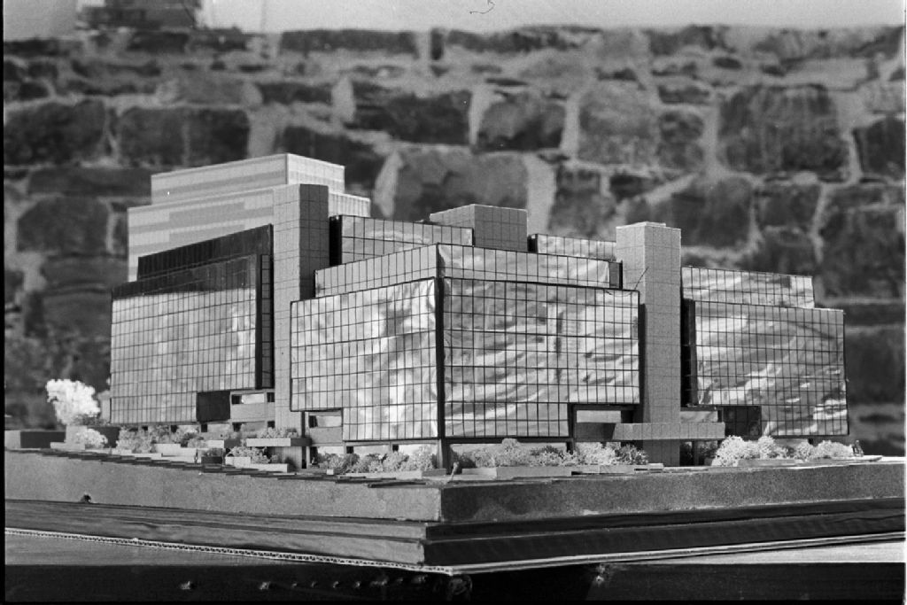 Maquette de l'édifice Laurentien et vues aériennes de Saint-Augustin, Donnacona, Louiseville, Joliette, Laval, du Saint-Maurice à Trois-Rivières et d'un glissement de terrain sur la rivière Chacoura près de Saint-Léon de Maskinongé