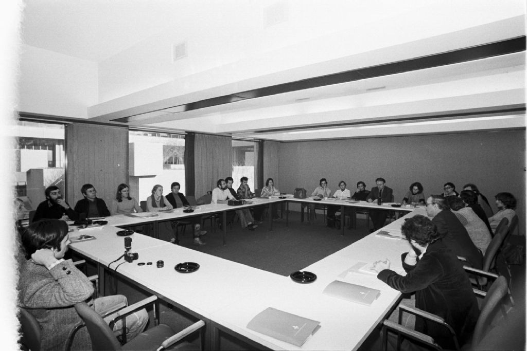 Groupe de graphistes de Paris à la maison Turmel, 1976-11-08, Archives nationales à Québec, Fonds Ministère des Communications, (03Q,E10,S44,SS1,D76-620), Raymond Duguay et Claude Gaboury.