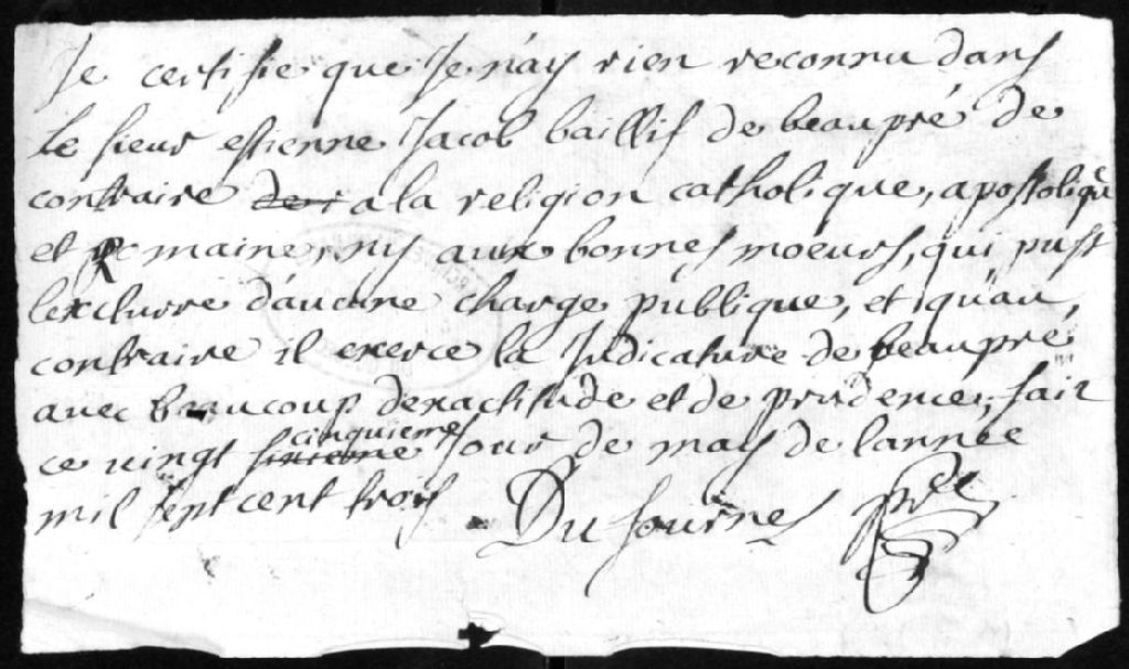 Certificat de bon catholique de M. Étienne Jacob, 25 mai 1703, Archives nationales à Québec, Collection Centre d'archives de Québec, (03Q,P1000,S3,D1017).