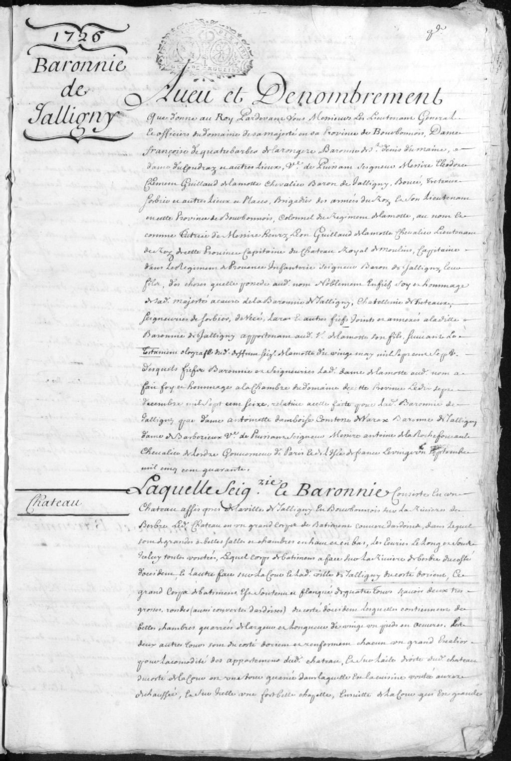 - Ce dossier est constitué d'un document concernant l'aveu et le dénombrement de la baronnie de Jalligny, en France, appartenant à M. le Comte de Lamotte (La Motte), en copie manuscrite de 96 pages