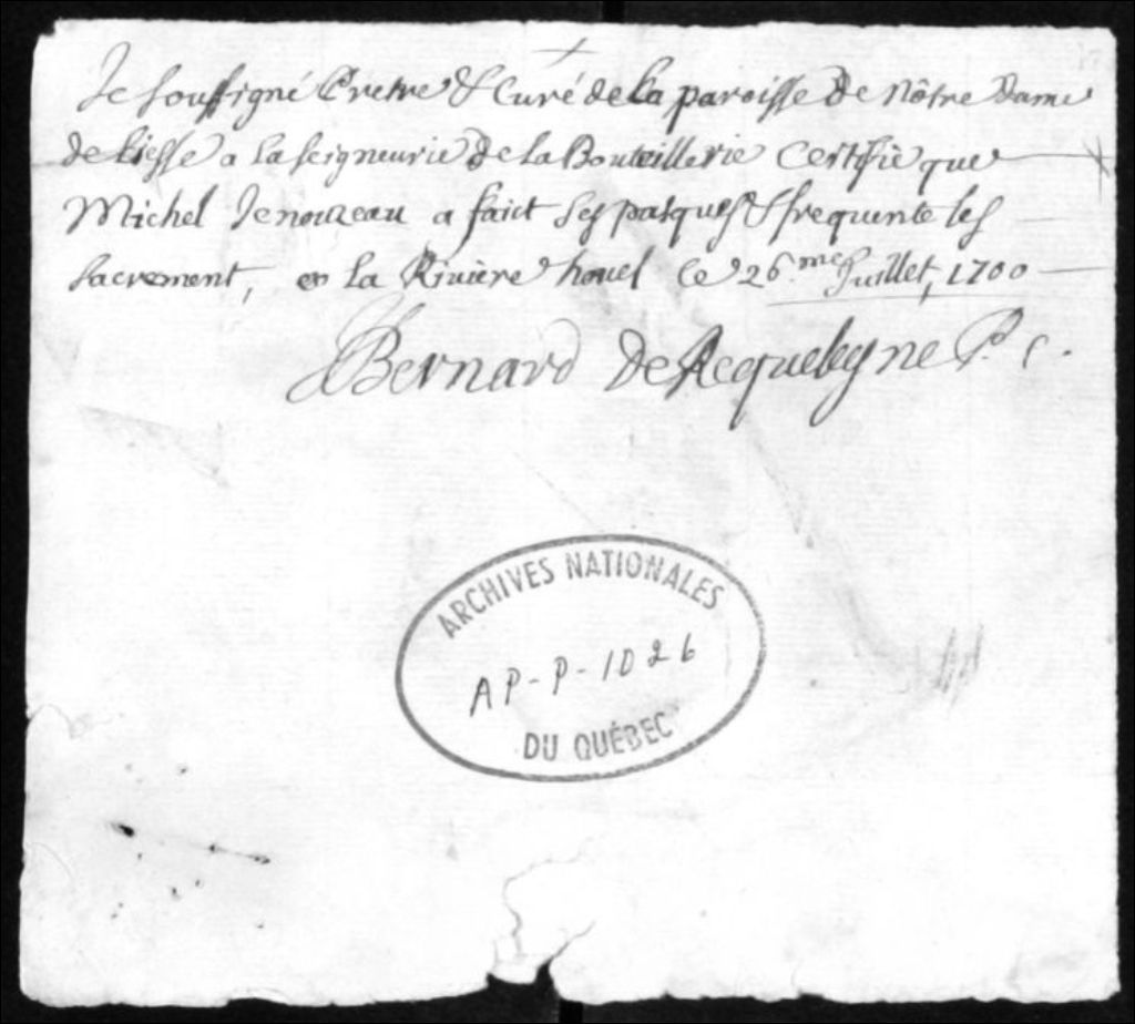 Certificat de communion pascale de M. Michel Jenouzeau, 26 juillet 1700, Archives nationales à Québec, Collection Centre d'archives de Québec, (03Q,P1000,S3,D1026).