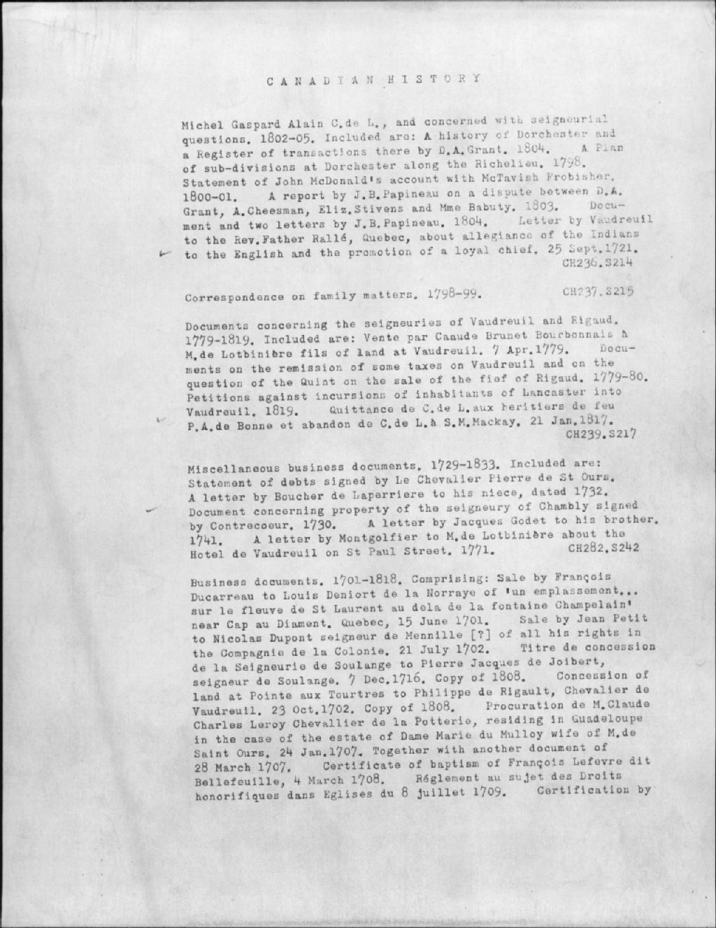 "Etat général de mes affaires au huit aoust mil sept cent soixante quatre ..". Signé Chartier de Lotbinière. Xérox. Journal de M.-G.-A. Chartier de Lotbinière, 1815-1816. Xérox. "Chronological notes on the career of Robert Unwin Harwood", 1798-1863, par John Thompson. Xérox. Notes et arbre généalogiques de la famille Chartier de Lotbinière. Xérox. Inventaire des paiers de Lotbinière conservés à McGill