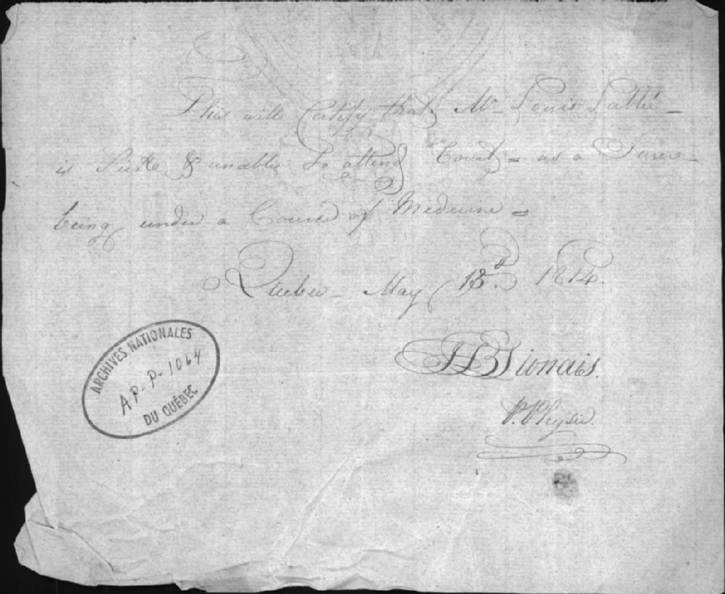 Certificat médical pour Louis Labbé pour exemption au juré à la cour, 13 mai 1814, Archives nationales à Québec, Collection Centre d'archives de Québec, (03Q,P1000,S3,D1064).
