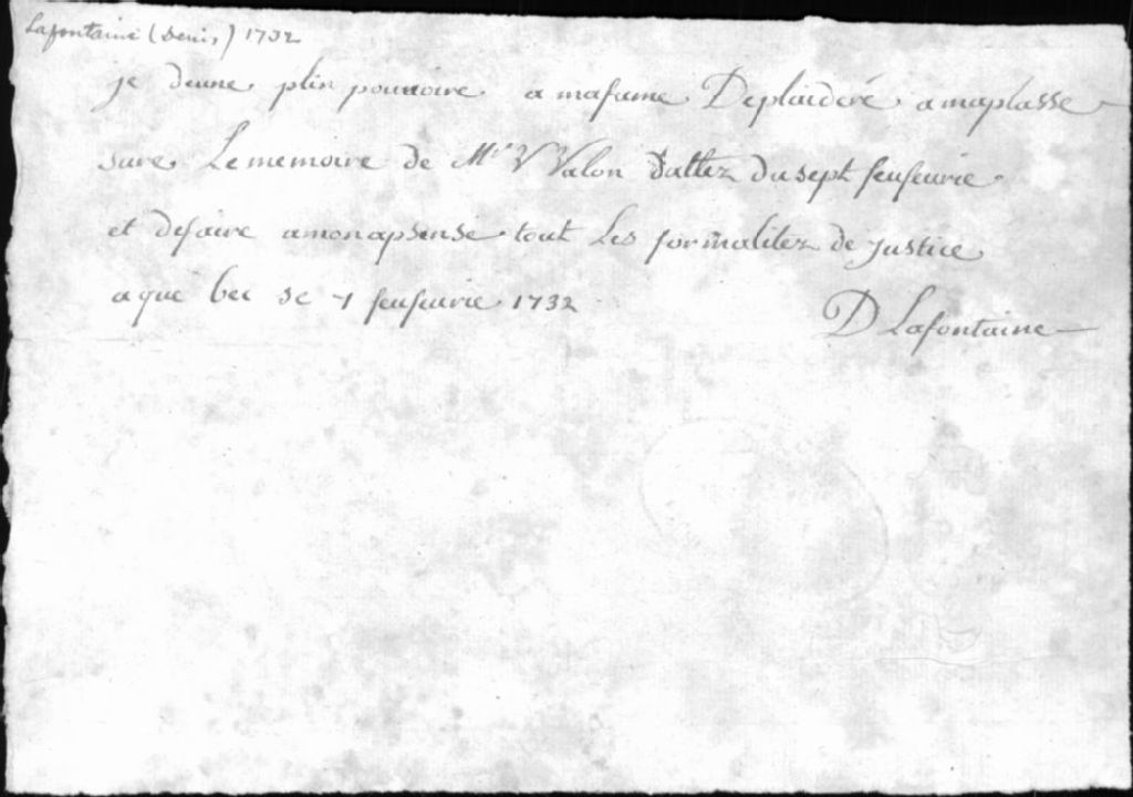 - Ce dossier est constitué d'un mémoire des marchandises fournies à Mlle Peltier, 9 décembre 1727 et de deux procurations à sa femme, 1732 signé Denis Lafontaine
