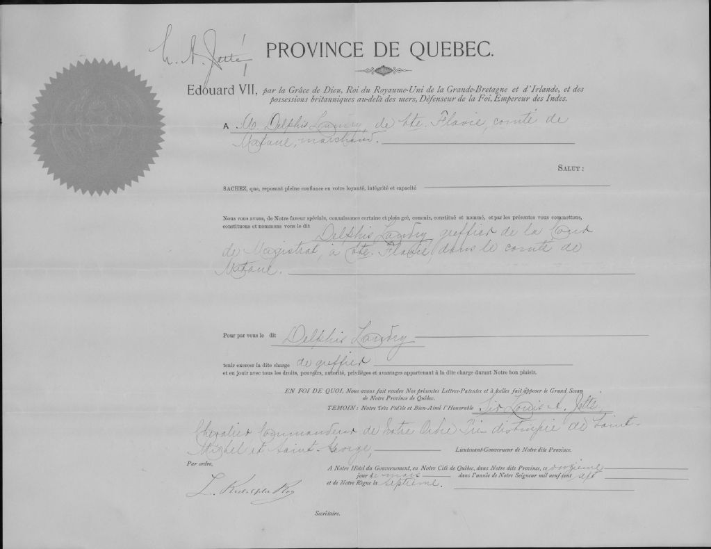 - Ce dossier est constitué d'une nomination comme greffier à la cour du magistrat à Ste-Flavie, comté de Matane