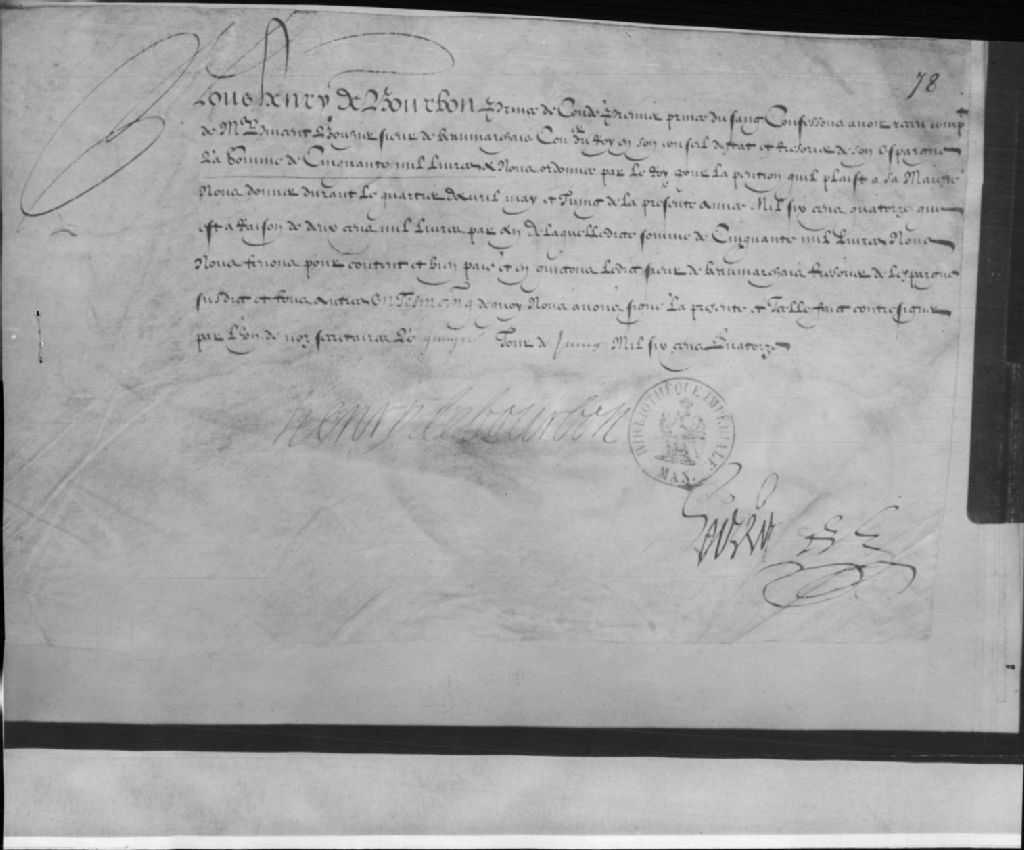- Ce dossier est composé du photostat d'un reçu accordé au Sieur de Baumarchais, de Paris, par Henry de Bourbon, prince de Condé, pour sommes reçues en appointements en 1614