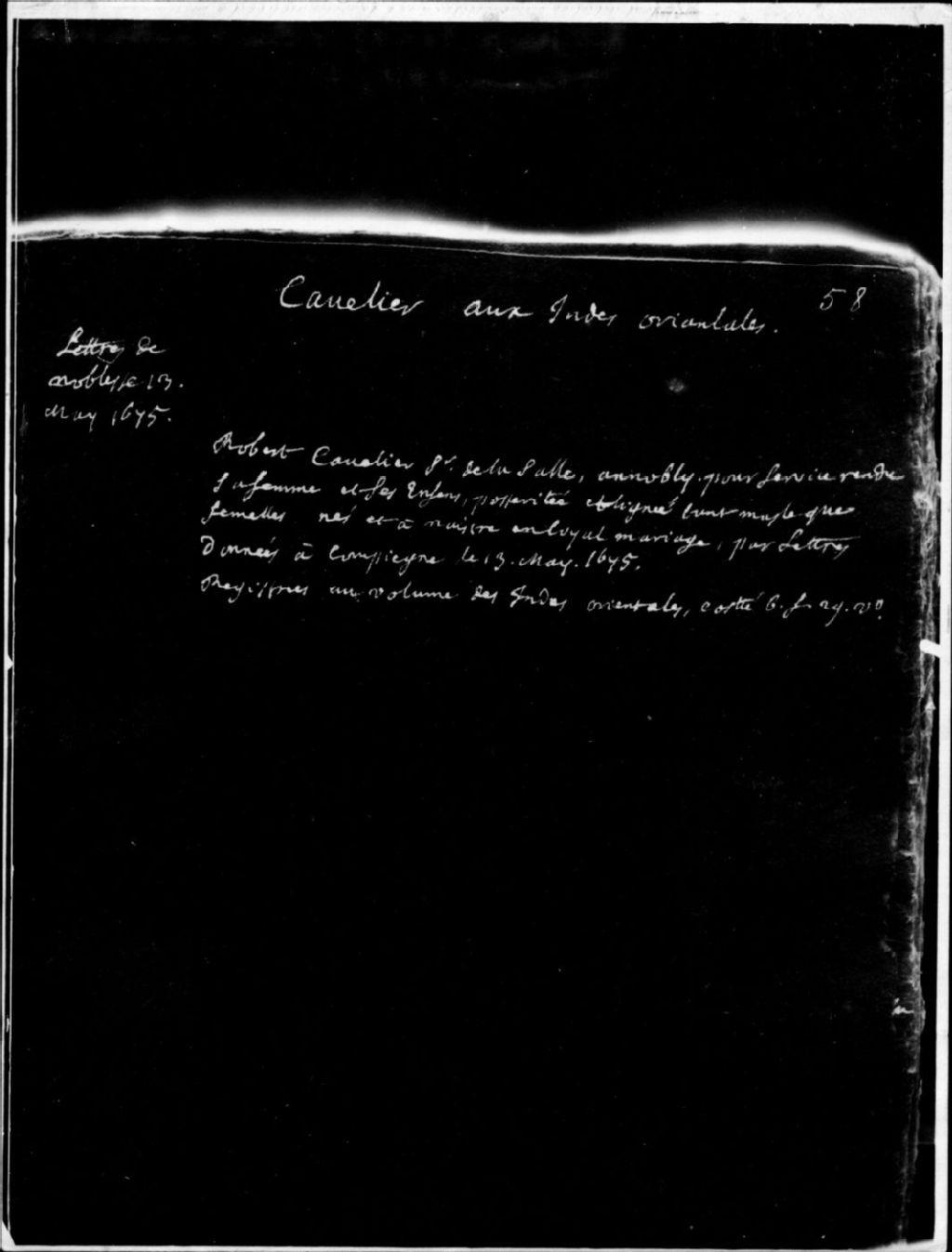 - Ce dossier est constitué d'une lettre de noblesse de Robert Cavelier sieur de LaSalle (1643-1687), mai 1675, sur photostat, d'une concession de fief pour le sieur Robert Cavelier de LaSalle, 11 janvier 1669, en copie dactylographiée
