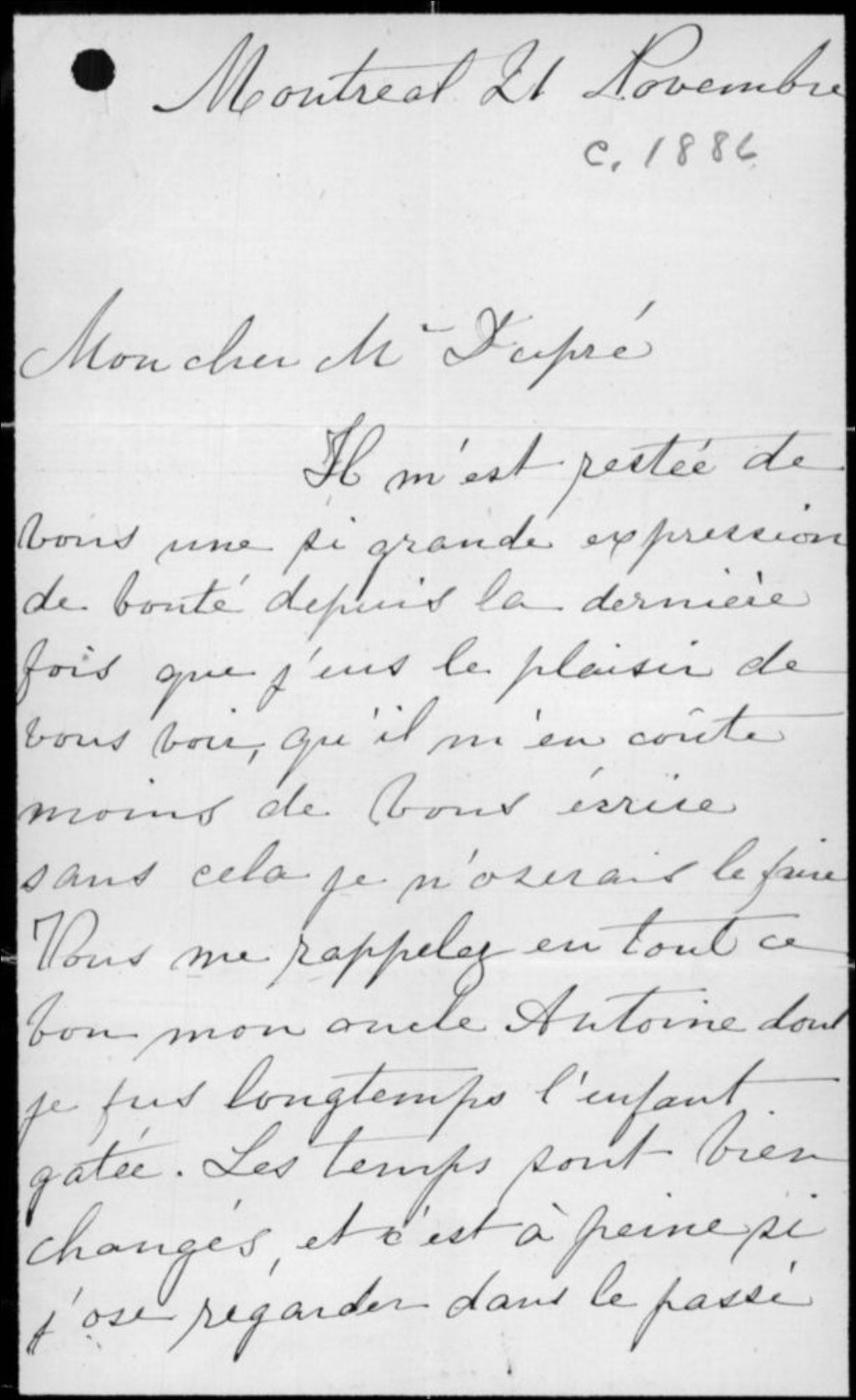 - Ce dossier est constitué des documents suivants: un contrat de mariage entre Edouard Dupré et Julie Leblond, 21 mai 1842; un extrait du contrat de mariage de Julie Leblond, 24 mai 1842; un extrait du registre des mariages entre Jacques-François Cugnet et Josephte Bettour de Lafontaine, 23 mai 1791; un extrait des registres des mariages entre J.-B. Lecompte Dupré et Marie-Anne Hervieu, 13 juillet 1758; une lettre de F. Bourgeau, curé, à Edmond Dupré, 14 octobre 1885; quatre lettres de (Dhenin L'ainé ?) à M. Lecompte-Dupré fils; trois lettres de Mathilde Dupré à son cousin, c.1886; une lettre de S.G. Legendre à son oncle, 22 mars 1884; une lettre de M. Martin, prêtre à un inconnu au sujet des familles Drainville, Lecompte, etc.; un billet au Colonel Dupré l'avisant que les deux militaires attendus sont arrivés; une lettre de (Casgrin ?) à M. Dupré; un mémoire du bureau d'administration des Pauvres de Montréal (s.d.)