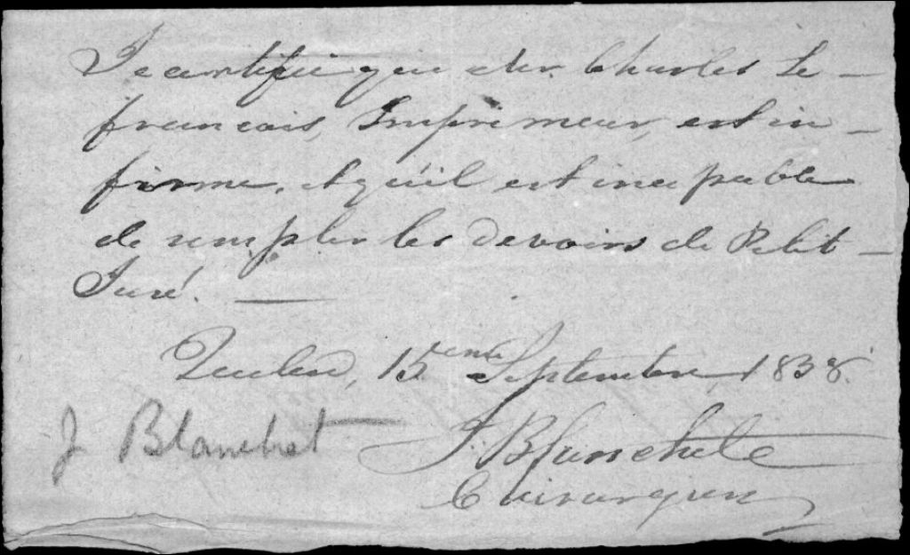 - Ce dossier est constitué d'un certificat du chirurgien J. Blanchette qui affirme que le nommé Lefrançois est incapable de remplir les devoirs de Petit Juré