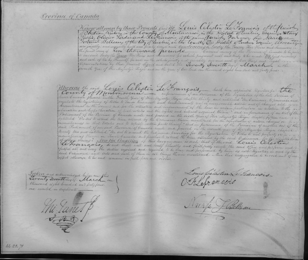 Nomination comme registrateur du comté de Montmorency de Louis-Célestin Lefrançois, 1844, Archives nationales à Québec, Collection Centre d'archives de Québec, (03Q,P1000,S3,D1225).