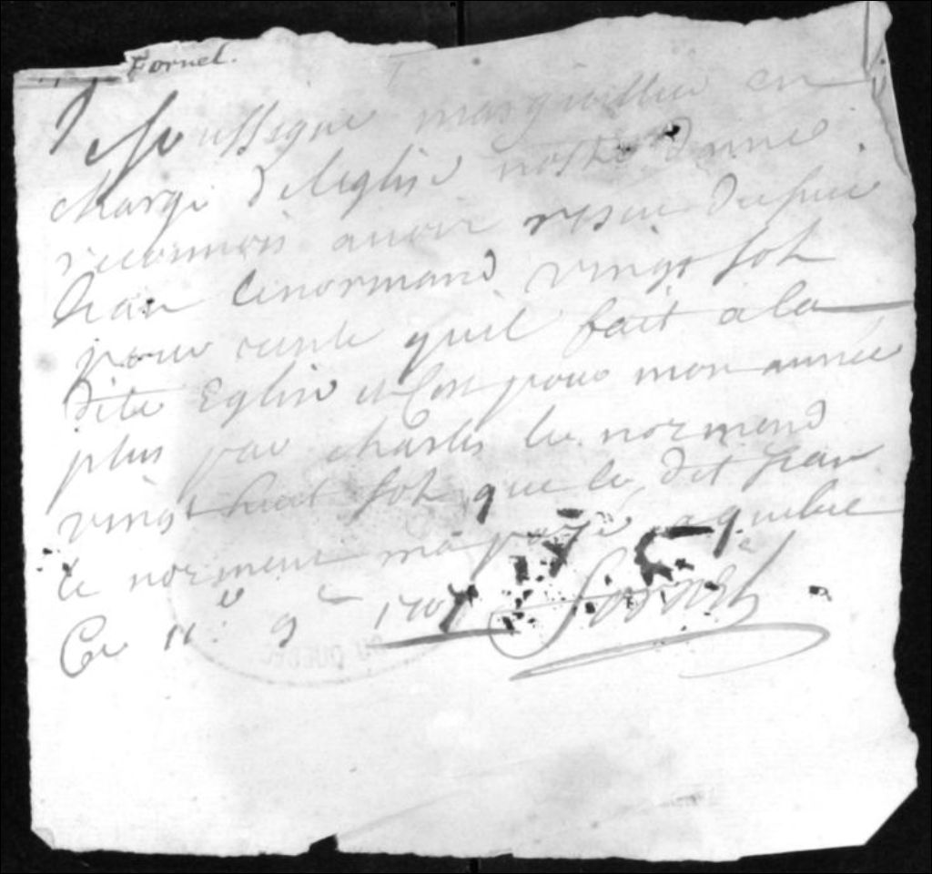 - Reçu accordé à Jean Lenormand par le marguillier Fornel pour le paiement de ses rentes