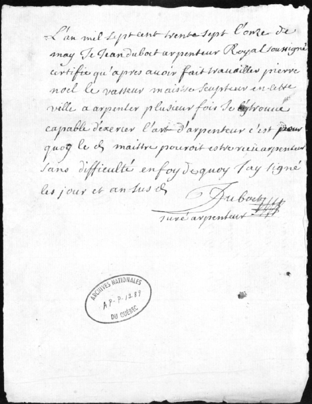 - Ce dossier est constitué d'un certificat de capacité comme arpenteur, signé Duboct, 1737, en copie manuscrite et d'un procès-verbal de mesurage de la Grande-Allée à Québec, 24 mai 1764