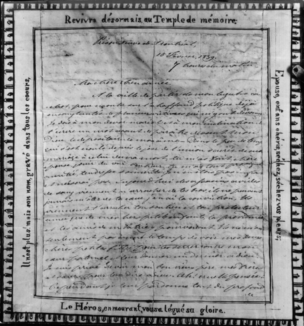 - Ce dossier est constitué d'une lettre à un ami, co-prisonnier, 22 janvier 1839, en copie dactylographiée; d'une lettre au public et à ses amis, 14 février 1839, sur photostat; d'une lettre du chevalier de Lorimier à sa femme, 15 février 1839, sur photostat