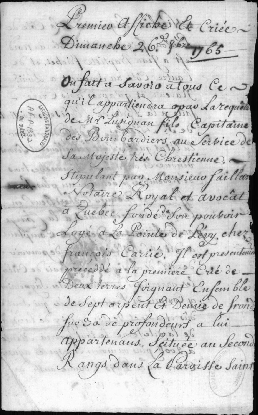 - Ce dossier est constitué de la première affiche et criée de deux terres sises au second rang dans la paroisse de Saint-Nicolas, signée par le notaire Saillant