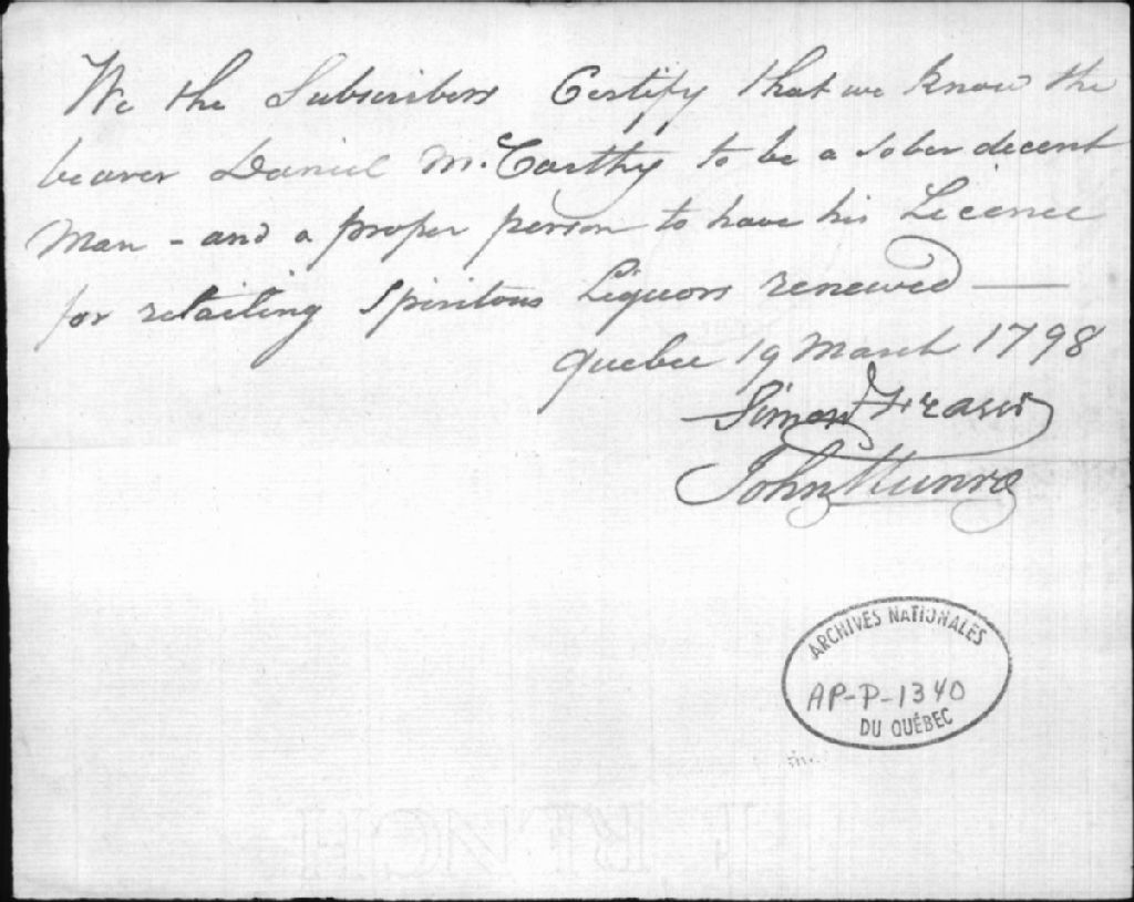 Certificat de bonne conduite pour obtenir une licence de taverne pour Daniel McCarthy, 19 mars 1798, Archives nationales à Québec, Collection Centre d'archives de Québec, (03Q,P1000,S3,D1340).
