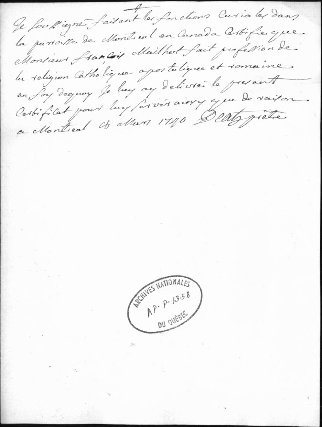 Certificat de catholicité de François Mailhot, 8 mars 1740, Archives nationales à Québec, Collection Centre d'archives de Québec, (03Q,P1000,S3,D1358).