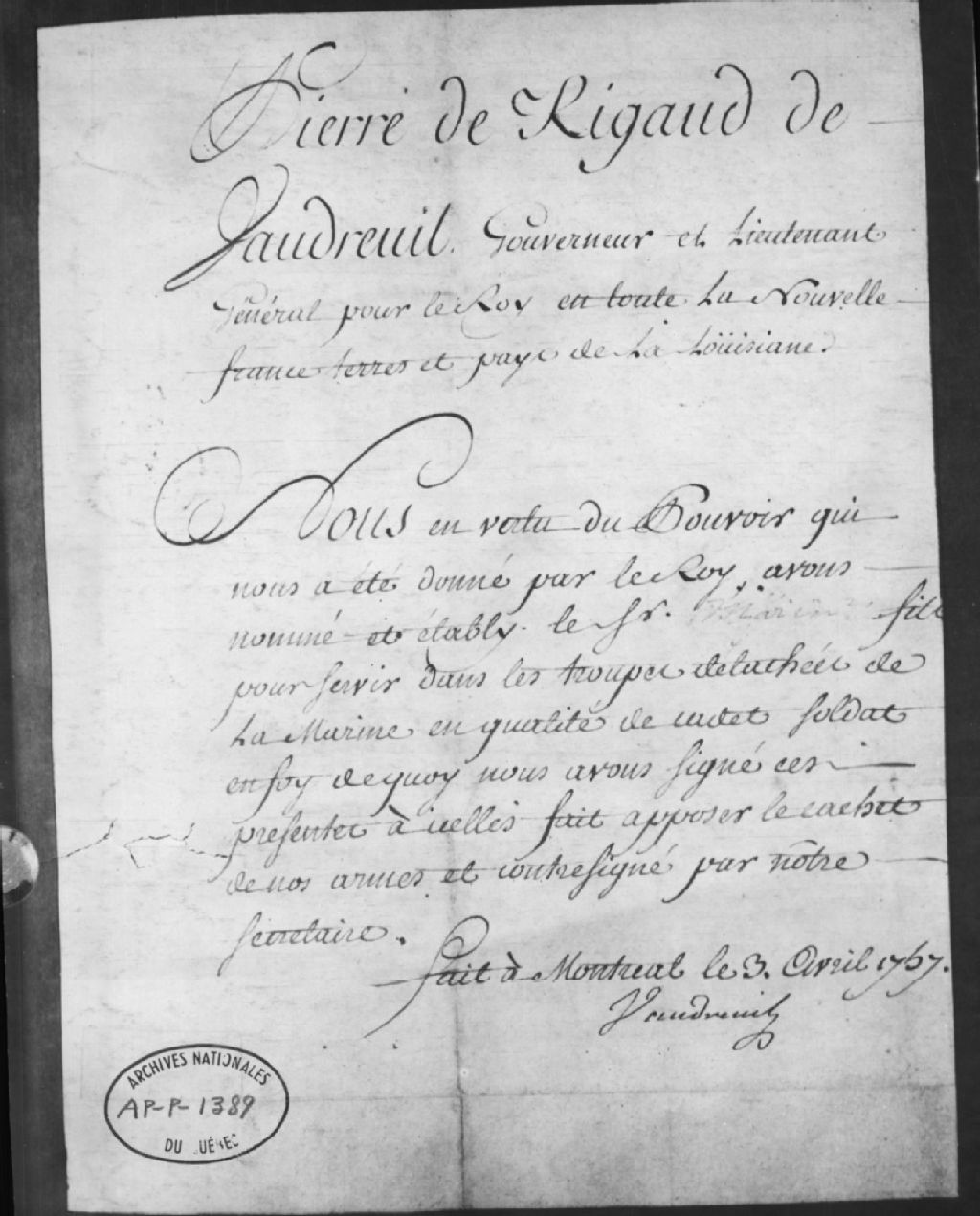Nomination du Sieur Marin comme cadet soldat dans les troupes de la marine, 3 avril 1757, Archives nationales à Québec, Collection Centre d'archives de Québec, (03Q,P1000,S3,D1389).