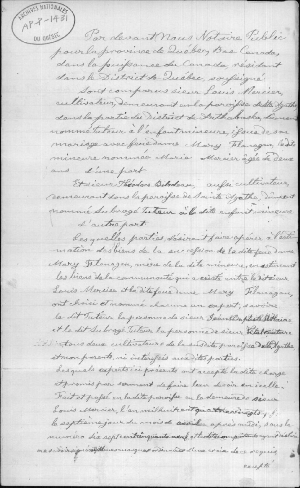 Ce dossier contient les copies manuscrites des documents suivants: la tutelle de Marie Mercier, fille mineure issue du mariage de Louis Mercier et de feue Mary Flanagan; un acte d'assemblée de parents de Marie Mercier, fille mineure issue du mariage de Louis Mercier et de feue Mary Flanagan; la nomination d'experts et rapports de ceux-ci (J.-B. St-Hilaire et Vital Couture) concernant l'inventaire de biens de la communauté Mercier et Flanagan et l'inventaire de biens de la communauté Mercier et Flanagan