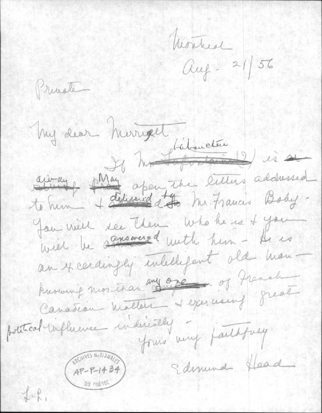Lettre d'Edmund Head concernant François Baby