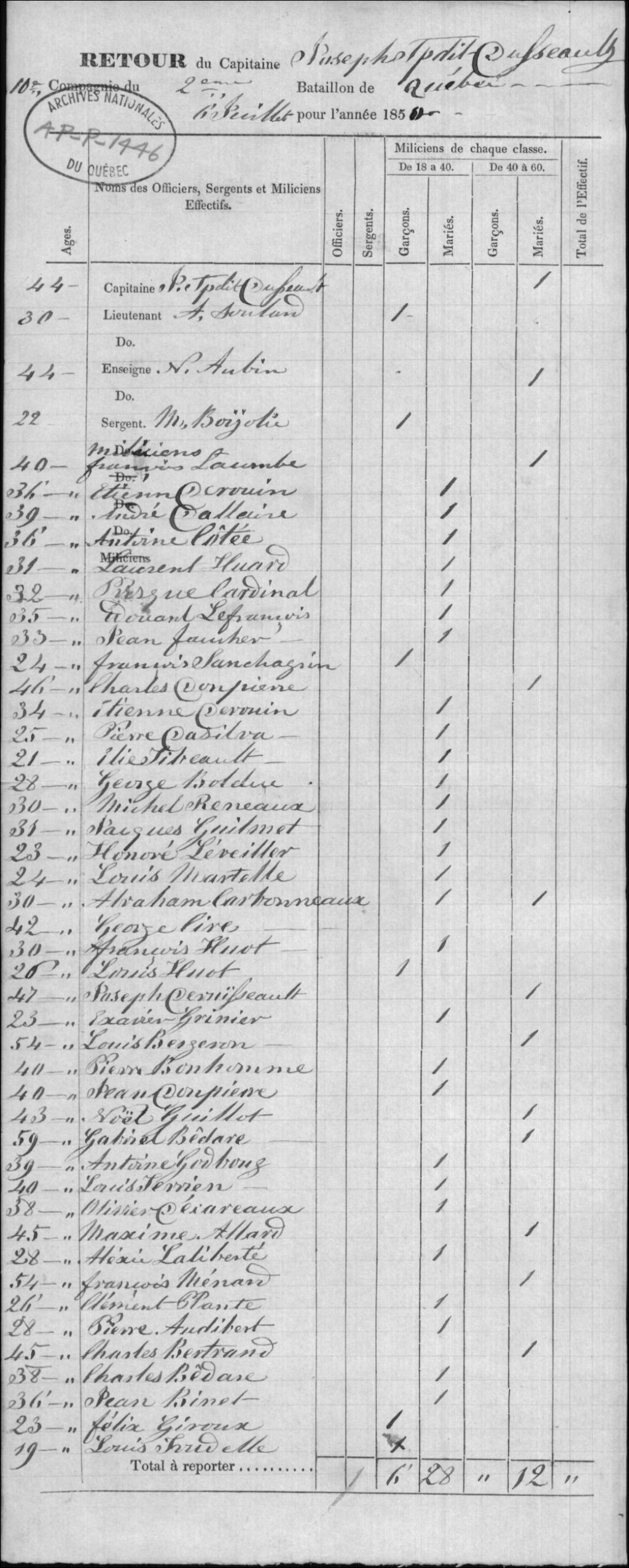 Rapport du capitaine Joseph Dusseault, 10e Compagnie du 2e bataillon de Québec pour l'année 1850, 1827-1843, Archives nationales à Québec, Collection Centre d'archives de Québec, (03Q,P1000,S3,D1446).