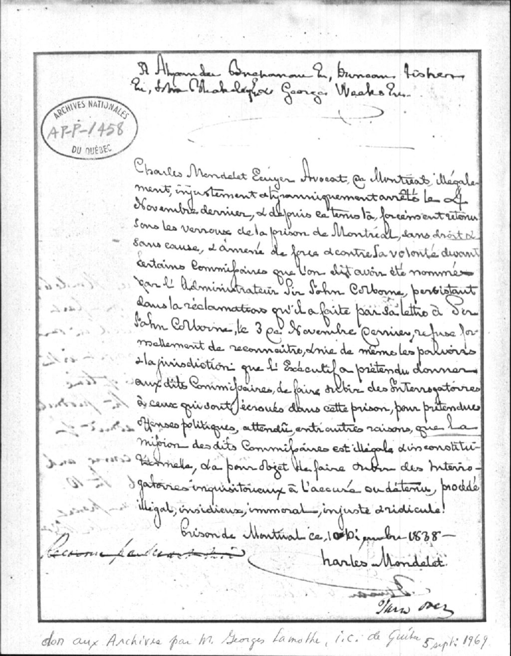 - Ce dossier contient la photocopie d'une déclaration de Mondelet adressée aux commissaires Alexander Buchanan, Duncan Fisher, John Bleakekey et Georges Weekes: Mondelet refuse de reconnaître les pouvoirs et la juridiction que l'Exécutif a prétendu donner aux dits commissaires de faire subir des interrogatoires aux personnes enfermées dans la prison de Montréal pour prétendus offenses politiques