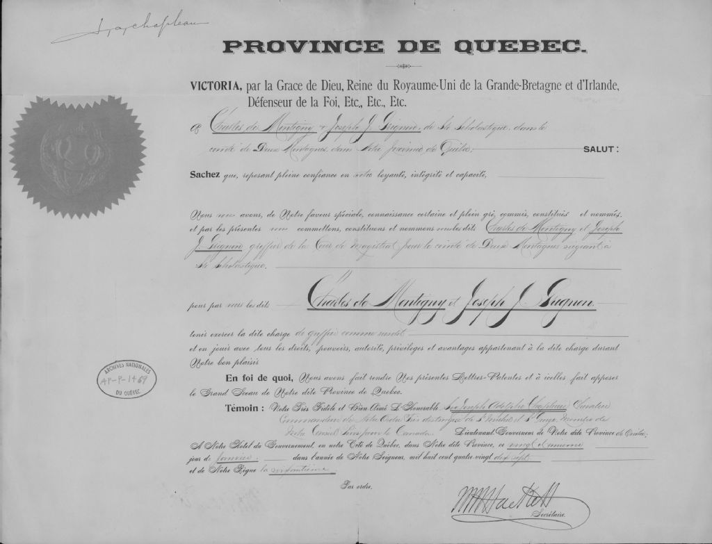 - Nomination comme greffier de la Cour de Magistrat pour le Comté de Deux-Montagnes à Charles De Montigny et Joseph-J. Grignon