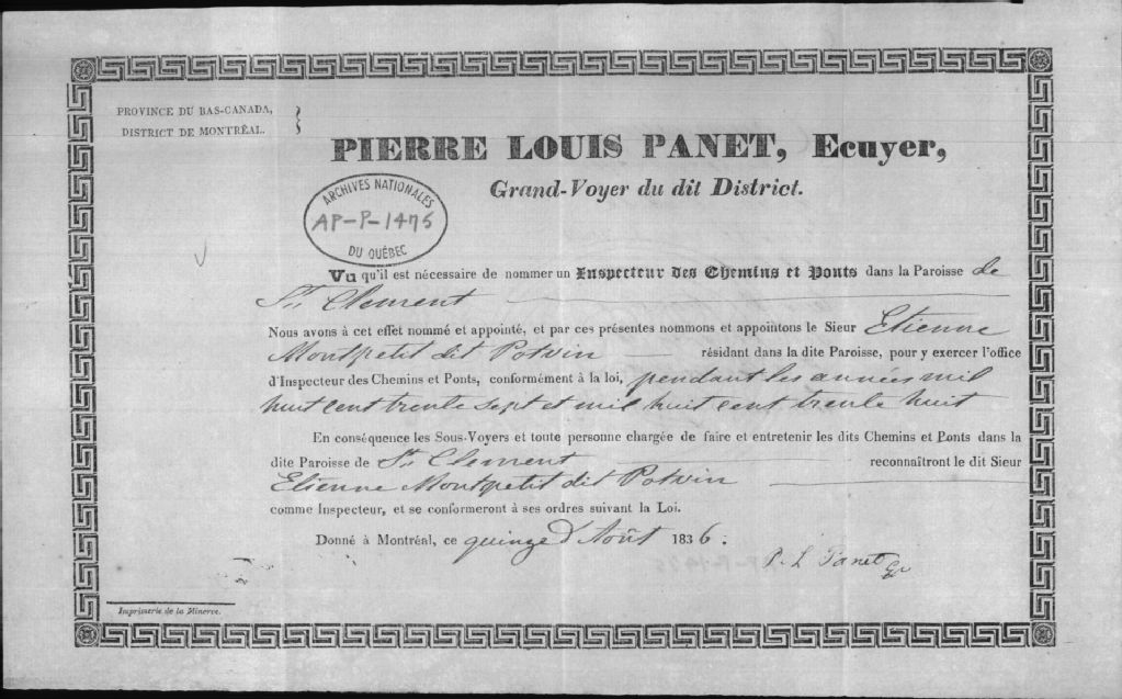 Nomination comme inspecteur des chemins et ponts dans la paroisse de St-Clément à Étienne Montpetit dit Potvin, 15 août 1836, Archives nationales à Québec, Collection Centre d'archives de Québec, (03Q,P1000,S3,D1475).