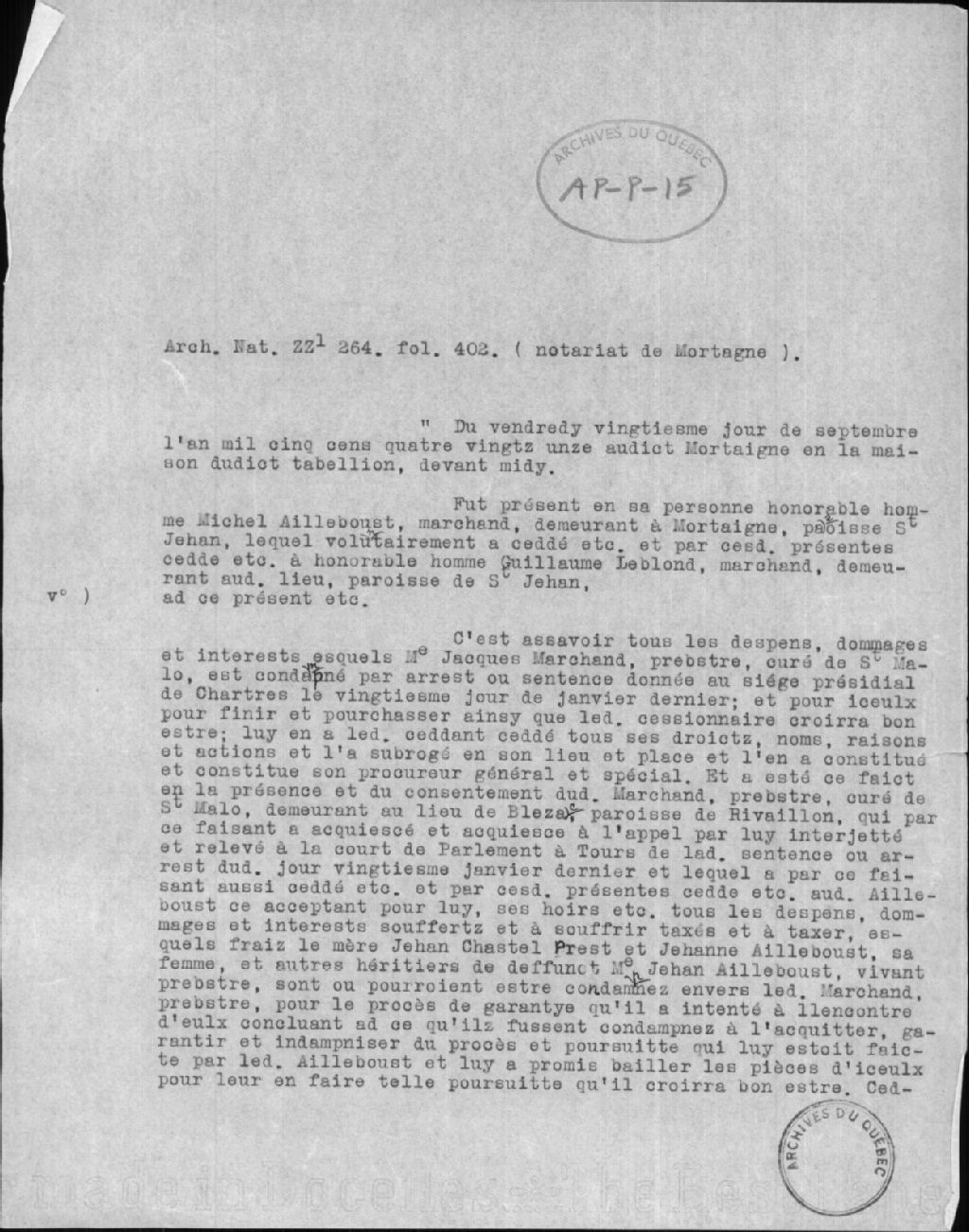 - Ce document est un acte notarié entre Guillaume Leblond (marchand), Michel Ailleboust (marchand) et Jacques Marchand (curé de St-Malo). Ce contrat fut signé à Mortaigne, en Perche