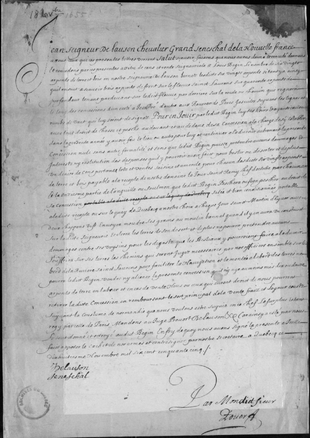 - Ce dossier est composé de l'original d'un document attestant la concession d'une terre à Louis Bégin en la seigneurie de Lauzon, signée de Lauzon