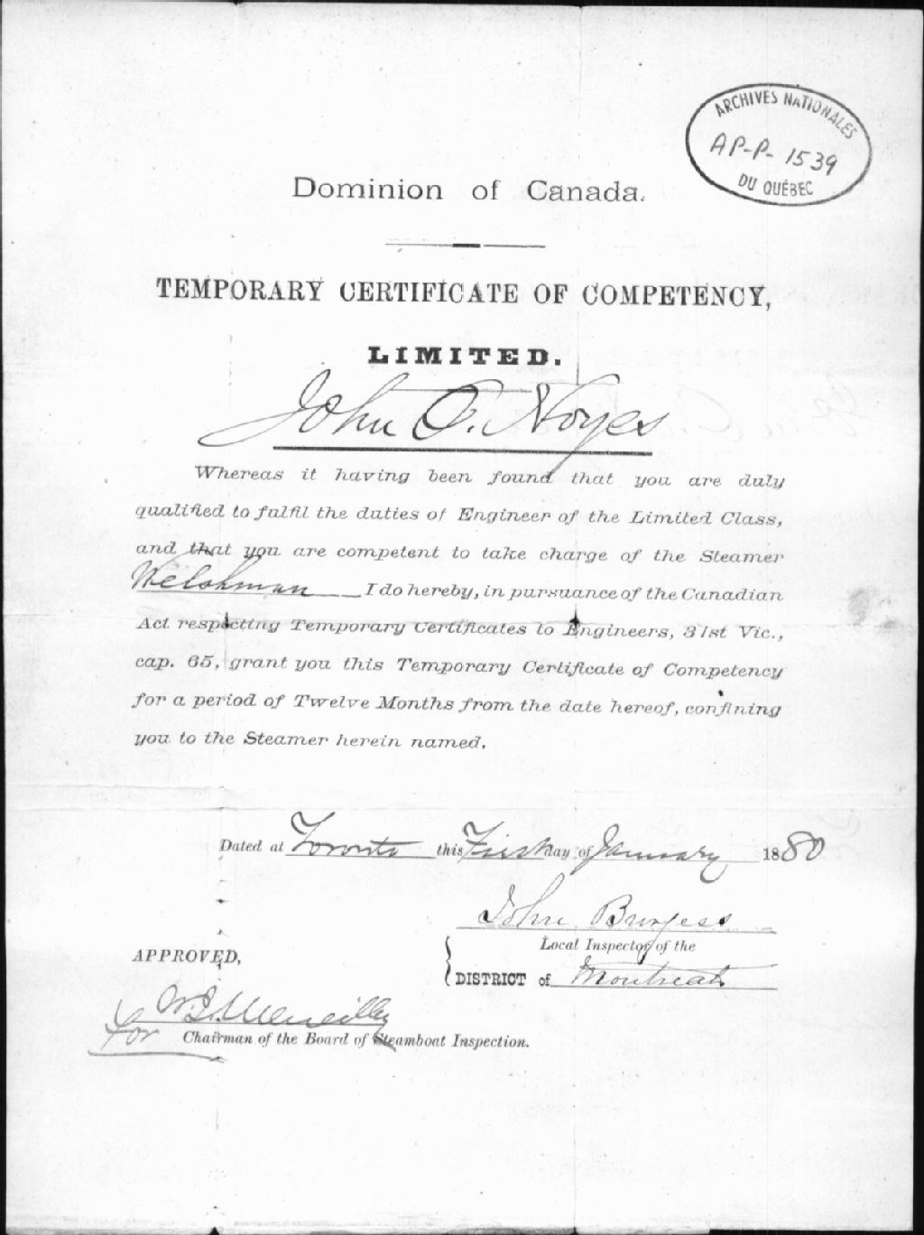 Certificat de compétence à John O. Noyes comme ingénieur de navire, 1 janvier 1880, Archives nationales à Québec, Collection Centre d'archives de Québec, (03Q,P1000,S3,D1539).