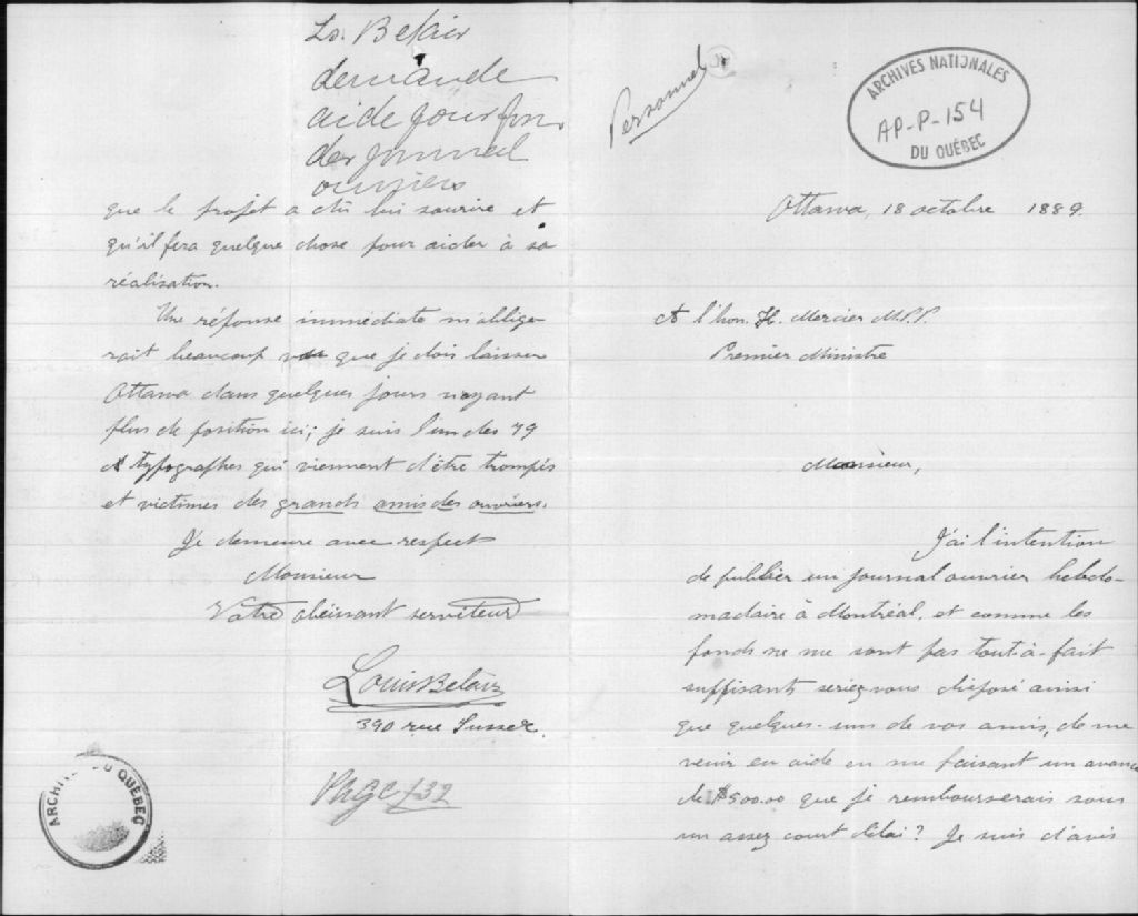 - Ce dossier est composé de 7 lettres entre Louis Bélair et Honoré Mercier concernant la fondation d'un journal ouvrier, en 1889, ainsi que 5 lettres entre Honoré Mercier, C.-A. Geoffrion et J-A. Genand demandant des renseignements sur Louis Bélair