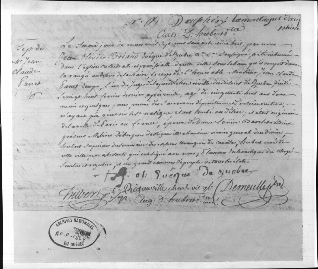 - Ce dossier contient un certificat de confession adressé à Panet par P. Albert Milland, récollet, 1745. Photostat de l'acte de sépulture de Jean-Claude Panet (1720-1778)