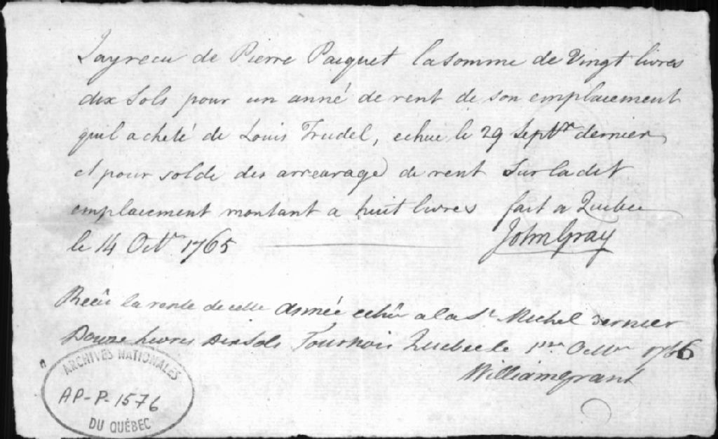 Reçu de John Gray à Pierre Paquet, 14 octobre 1765, Archives nationales à Québec, Collection Centre d'archives de Québec, (03Q,P1000,S3,D1576).