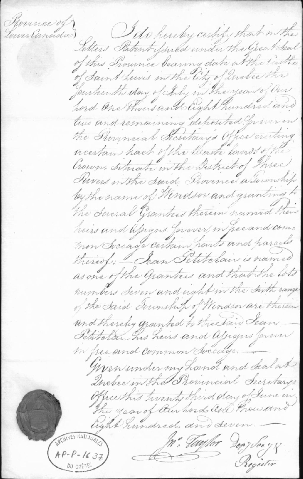 Certificat de concession de terre à Jean Petitclair dans le canton de Windsor, 23 juin 1807, Archives nationales à Québec, Collection Centre d'archives de Québec, (03Q,P1000,S3,D1637).