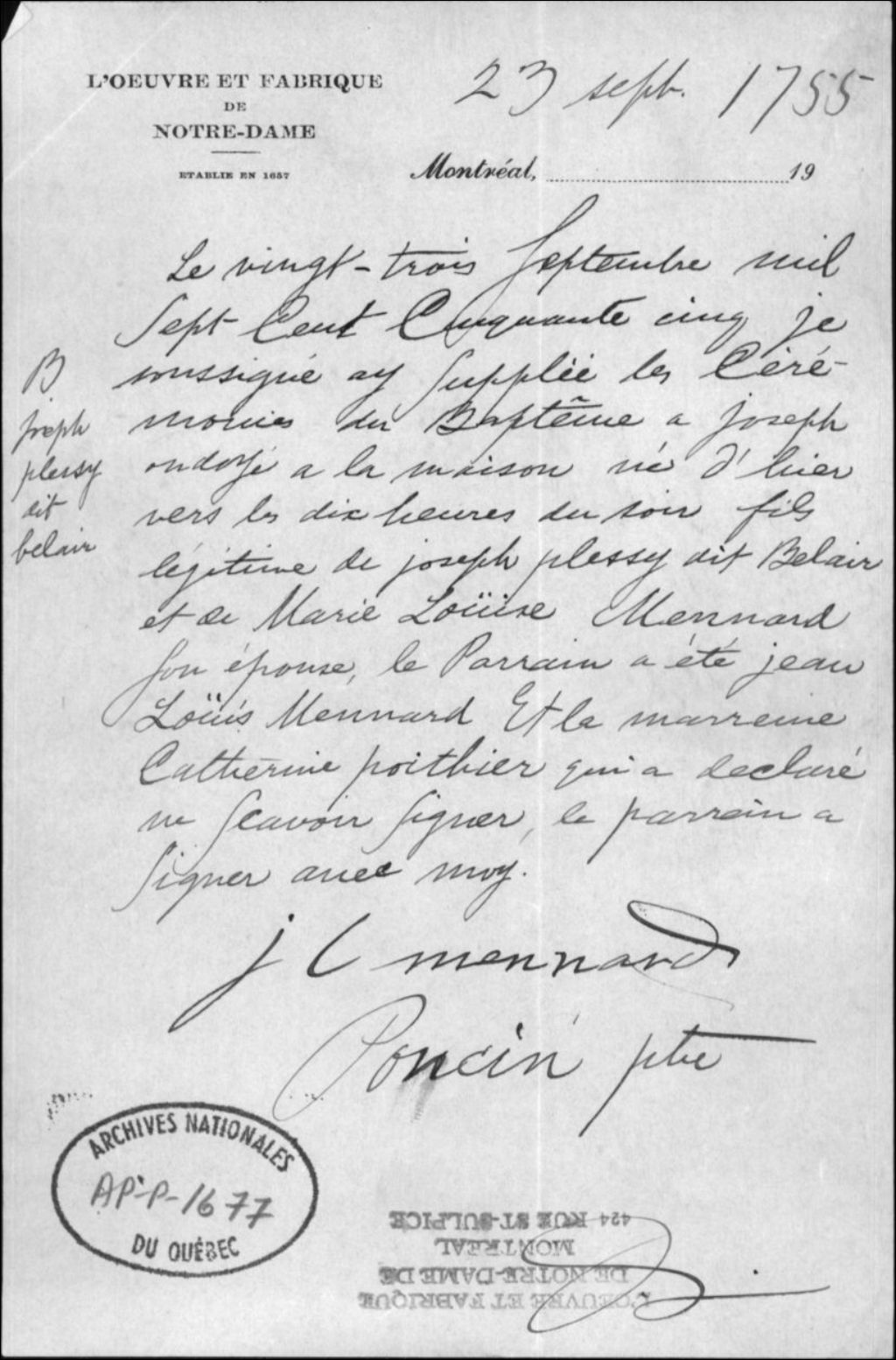 - Ce dossier contient vingt extraits de registres d'état civil concernant des membres de la famille Plessis dit Bélair: baptême de Jean-Louis Plessis, fils de Joseph Plessy et de Marie-Louise Bédard, 1754; mariage de Jean-Louis Plessis et de Marie-Anne Petit, en 1713; mariage de Joseph Plessis et Marie-Louise Ménard en 1752; baptême de Joseph Plessis, fils de Joseph et de Louise Ménard, en 1763; sépulture de Louise Ménard, femme de Joseph Plessis, décédée en 1790; baptêmes de Joseph Plessy dit Bélair, Joseph Plessis, Basile Plessy dit Bélair, Louis Plessy dit Bélair, Louise Plessis, Marguerite Plessis, Marianne Plessis, Marie-Amable Plessis, Marie-Marguerite Plessis, Marguerite Plessis dit Bélair, Ursule Plessis, Marie-Agathe Plessis dit Bélair, Jean-Baptiste-François-René Plessis, Marie Agathe Plessis et Marie-Thérèse Plessis (nés entre 1755 et 1780)