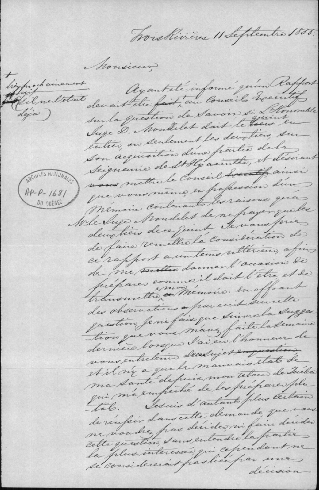 - Ce dossier contient le brouillon d'une lettre de Polette à Joseph Cauchon au sujet du droit de quint que le juge Dominique Mondelet (1799-1863) doit pour la seigneurie de St-Hyacinthe. Lettre de Joseph Cauchon à Antoine Polette répondant à la lettre précédente